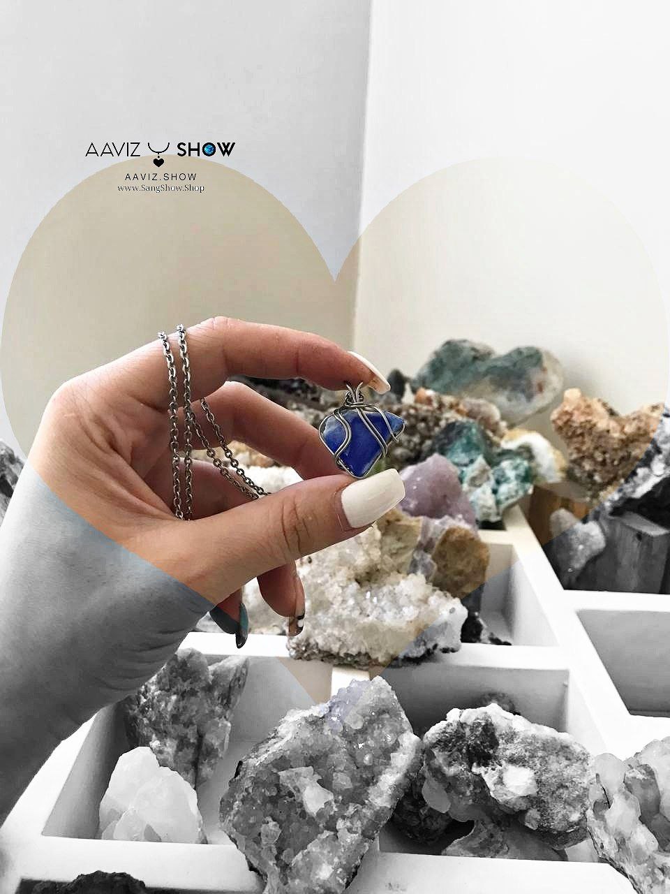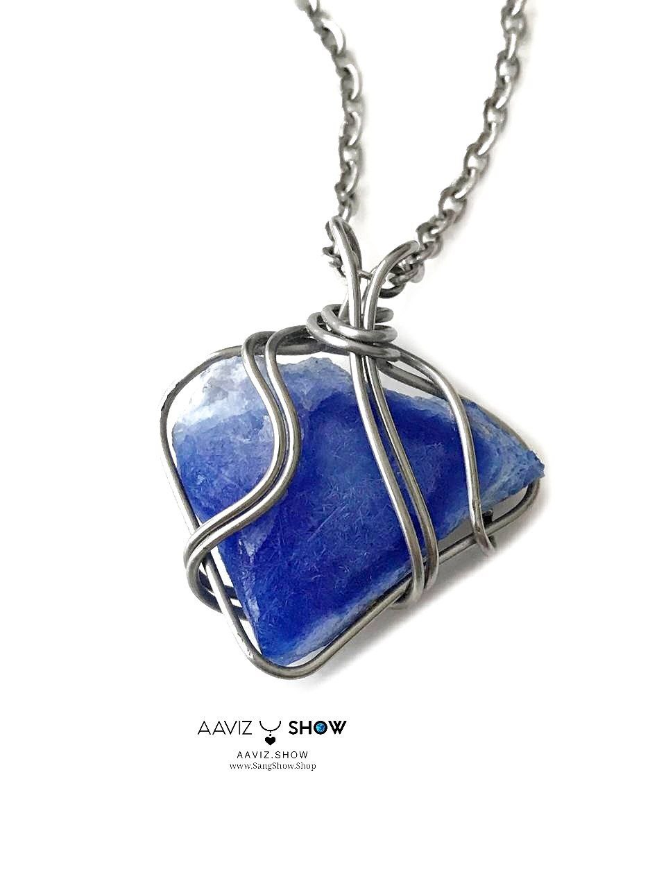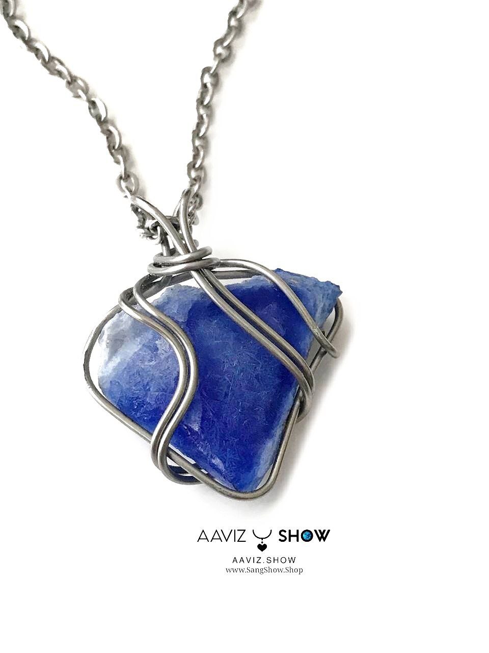 آویز مفتولی کوارتز آبی سنگ راف و معدنی ساخته شده با عشق خالص طبیعی و معدنی با خواص شگفت انگیز بهمراه زنجیر استیل ضد حساسیت
