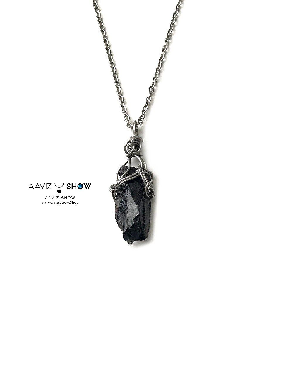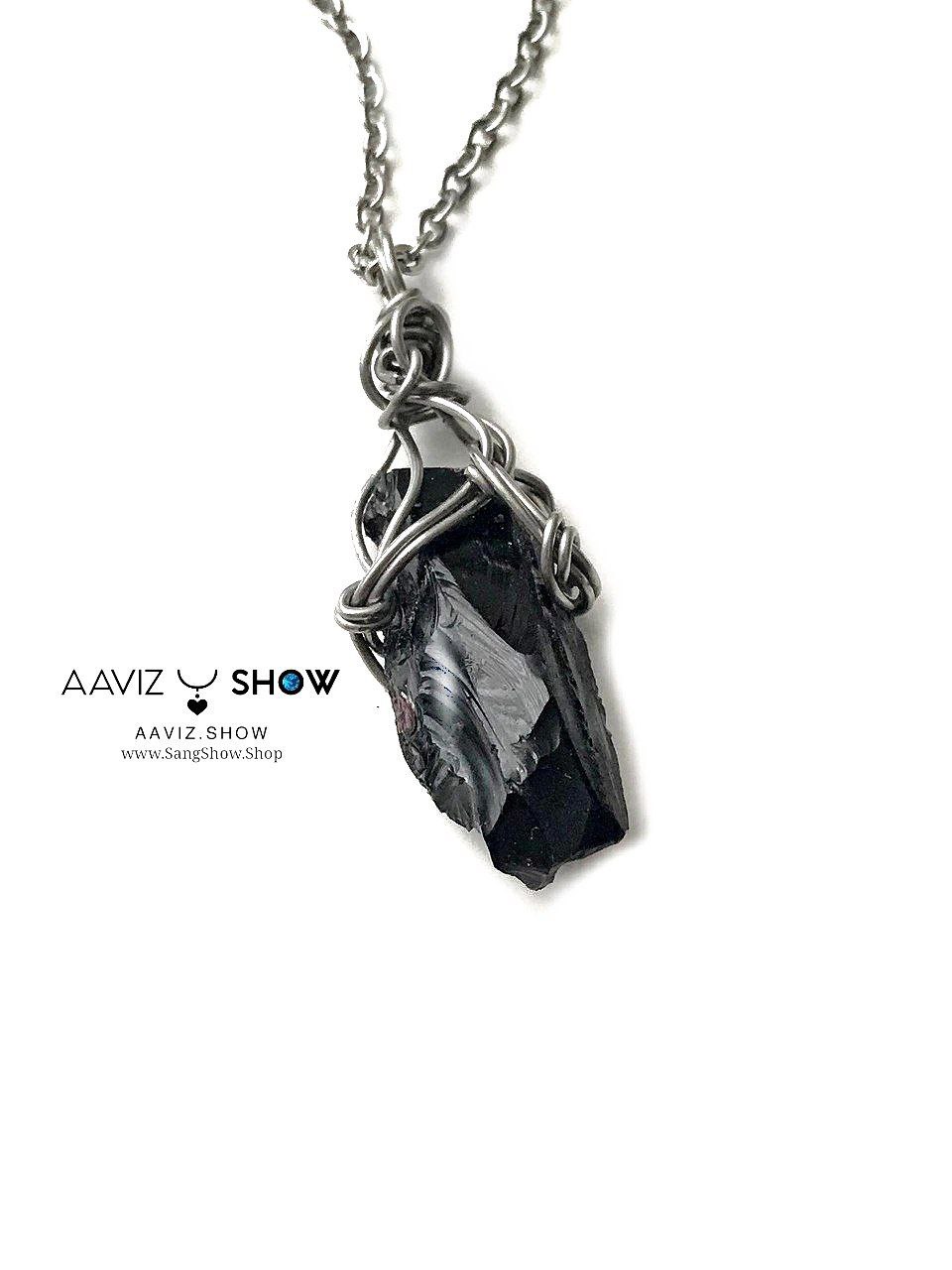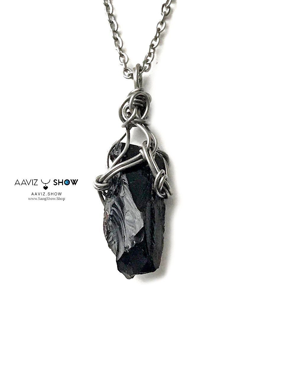 گردنبند سیاه ابسیدین نمونه راف و معدنی با قاب مفتولی استیل ساخته شده با عشق خالص طبیعی و معدنی با خواص شگفت انگیز بهمراه زنجیر استیل ضد حساسیت